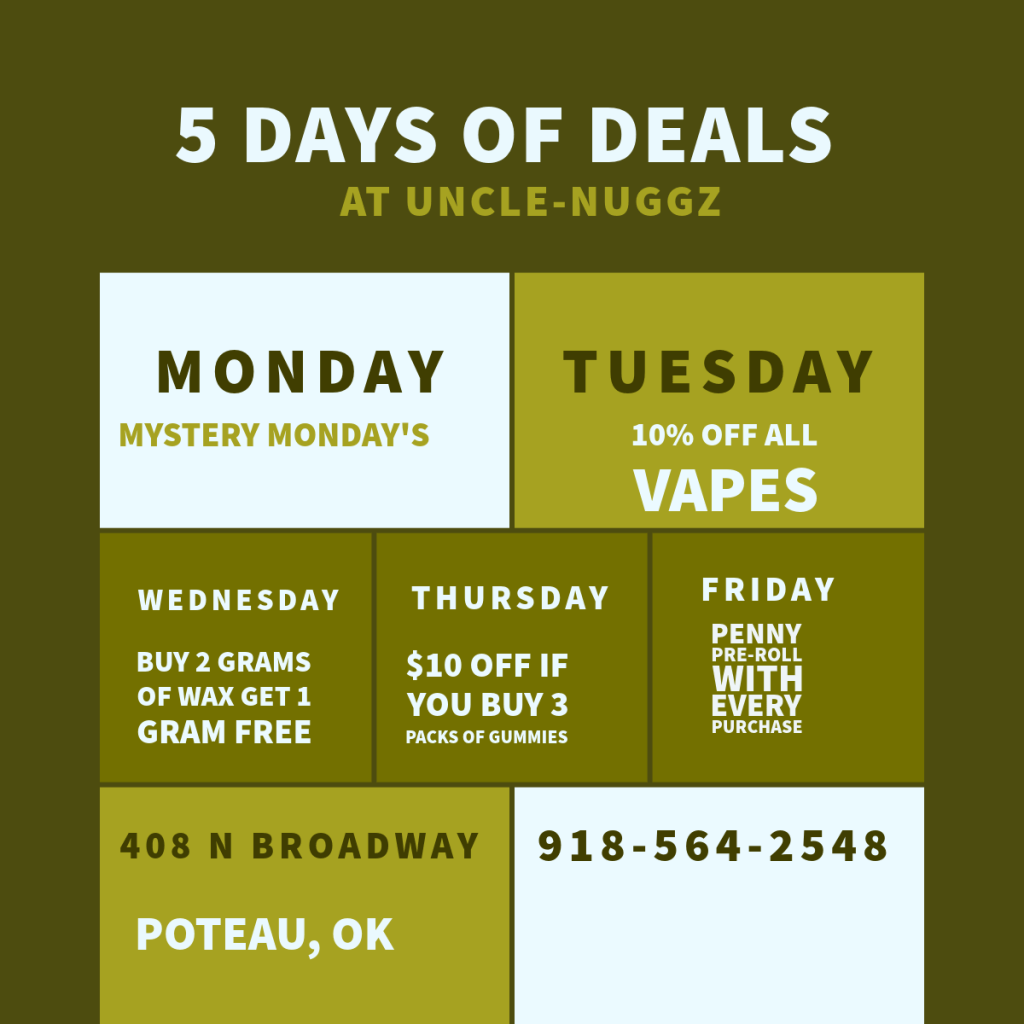 come and experience the Family ran and locally owned Uncle Nuggz! Your one-stop shop for all your medical needs. with our amazing relationships with local growers and labs, we can offer a huge selection of anything you could imagine, from exotic strains, to amazingly strong and delicious edibles, and some of the purest and most tasty selection of wax, budder, hash, and active rosin! and that’s not even mentioning the HANDBLOWN glass pipes and bongs made from a LOCAL craftsman!